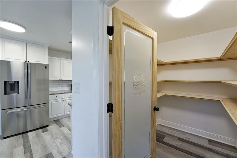 - Kitchen: Cabinets White, Pantry, Pantry Walk-In, Solid Surface Counters, View to Family Room